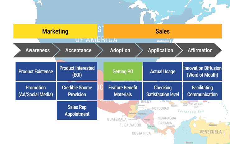 미국-유럽-중국-브라질-인도 등과 같은 거대 단일시장을 진출할 경우 제품 인지도 향상을 위한 판매촉진과 관심기업을 발굴하는 CMO(마케팅 임원)을 선임한 뒤, 주문서 수령,