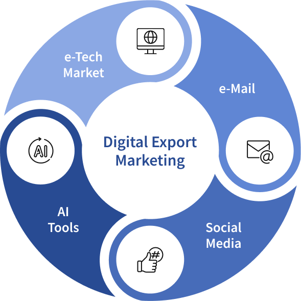 △목표국가 선정 △마케팅 기획 △거래선(바이어/파트너) 발굴 △협약 체결 등과 같은 수출 마케팅 캠페인 대행인터넷과 디지털 기술을 활용한